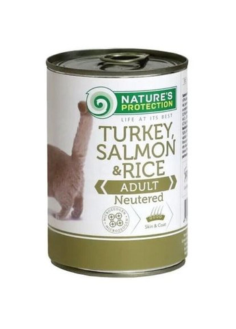 Консерви для кішок NATURE'S PROTECTION — це вологий корм Super Premium класу, створений для задоволення різних потреб молодих і зрілих кішок. Натуральне високоякісне м'ясо, придатне для вживання людьми, є основним джерелом білків. Акуратно приготовані, щоб зберегти натуральний смак, аромат і поживні речовини кожного рецепта. Ідеально поєднується із сухим NATURE'S PROTECTION кормом. Одна баночка готових до вживання консервів — оптимальна кількість корму, щоб погодувати кішку один раз, тому зручні і вдома, і в дорозі, і на виставках... Консервований котячий корм Neutered Turkey, Salmon&Rice — це дрібно порізані шматочки натуральної індичини та лососини з рисом, у ніжному бульйоні, збагачені мінералами. З дрібно порізаних шматочків натурального м'яса та риби З мінералами У складі немає консервантів, кісткового борошна, домішок сої та зерна, підсилювачів смаку й аромату, не використовується м'ясо механічної обвалювання Вирізняються чудовим поїданням Герметичне, зручне паковання, яке легко відкривається Консервований корм подавайте за кімнатної температури. Відкриту банку необхідно тримати в прохолодному місці та використати упродовж 3 днів. Консерви виготовлені на замовлення та під контролем ТМ Nature's Protection у Німеччині.