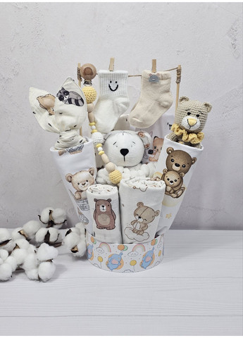 Усі елементи виготовлені з натуральних та безпечних матеріалів. Букет виглядає дуже естетично та стильно, а його вміст дійсно стане у пригоді в перші місяці життя малюка.
