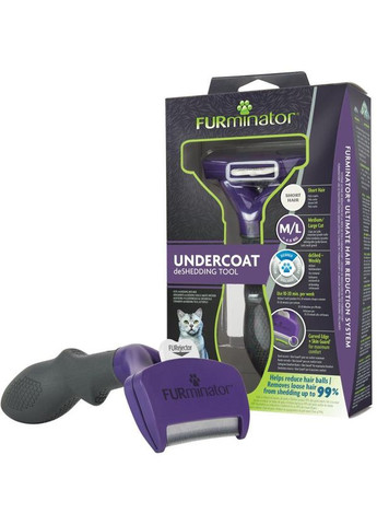 Інструмент FURminator L для котів великих порід (від 4,5 кг) із довгою шерстю зменшує линяння на 90%. Призначений для шерсті довше 5 см. Використовуйте на сухій шерсті 1-2 рази на тиждень протягом 10-20 хвилин. Інформація про продукт: Лезо інструменту проникає крізь остьове волосся, не пошкоджуючи його, і легко витягує мертві, слабо прикріплені волоски підшерстя Захисні краї Skin Guard® попереджають тиск леза на шкіру Вигнуте лезо відповідає контурам тіла тварини для комфорту в процесі вичісування Кнопка самоочищення FURejector® допомагає швидко скинути шерсть з інструменту, роблячи процес вичісування простішим та зручнішим Захист леза дозволяє убезпечити зубчики під час зберігання інструменту Переваги: Кнопка самоочищення FUREJECTOR®. Допомагає швидко скинути шерсть з інструменту, роблячи процес вичісування простішим та зручнішим. Леза із нержавіючої сталі. Проникає крізь остьові волосини, не пошкоджуючи їх, і легко витягує мертві, слабо прикріплені волосинки підшерстя. Вигнуте лезо відповідає контурам тіла тварини для комфорту в процесі вичісування. Ергономічна ручка. Для комфорту та простоти використання. РЕКОМЕНДАЦІЇ ЩОДО ВИКОРИСТАННЯ Використовуйте Інструмент проти линяння FURminator® згідно з рекомендаціями щодо застосування. Інструмент проти линяння не є гребінцем або пуходеркою, він зачіпляє і витягує слабо прикріплені, мертві волоски підшерстя, не зрізаючи і не пошкоджуючи остьове волосся. КРОК 1. Інструмент проти линяння потрібно використовувати на сухій шерсті. Для кращих результатів використовуйте його відразу після купання та сушки улюбленця. Лінійка FURminator® - це продукти, що забезпечують здоров'я шкіри та шерсті вихованця і при регулярному використанні значно скорочують кількість шерсті в будинку. КРОК 2. Грумінг - чудова можливість оглянути свого вихованця. У процесі вичісування звертайте увагу на можливі хвороби, синці та шкірні захворювання, які може приховувати шерсть тварини. Якщо ви помітили щось з перерахованого вище, припиніть вичісування і зверніться до ветеринара. Перед використанням інструменту проти линьки FURminator видаліть ковтуни та сплутування шерсті за допомогою Ковтунорізу FURminator® або Гребеня. КРОК 3. Використовуйте інструмент проти линяння за аналогією з гребінцем, акуратно проводячи ним по шерсті тварини у напрямку її росту, проникаючи зубчиками крізь шерстяний покрив. Почніть розчісування з голови, поступово просуваючись уздовж тіла тварини. Будьте обережні при розчісуванні області біля живота, лап, геніталій та ануса. Не зупиняйтесь надовго на одному місці. Незважаючи на те, що конструкція інструменту попереджає зайвий тиск на шкіру тварини, грубе вичісування із застосуванням сили може спричинити подразнення шкіри, тому уникайте зайвого тиску на неї. Якщо ви помітили почервоніння чи подразнення, припиніть вичісування. КРОК 4. Після того, як відмерлий підшерсток збереться на лезі інструмента, зніміть його із зубчиків за допомогою натискання на кнопку самоочищення FURejector®.