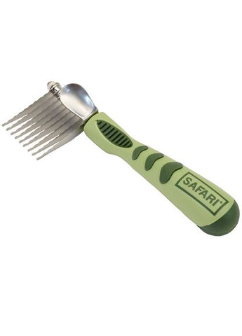 Бічний колтуноріз Safari Matt Remover призначений для видалення ковтунів у собак та котів усіх порід. Його загнуті леза акуратно зрізають колтуні, мінімально травмуючи шерсть. Перед цим інструментом не встоятиме навіть дуже щільні клубки сплутаної шерті. Тильна сторона зубців зроблена округлою, щоб колтуноріз не травмував шкіру вихованця. Ергономічна ручка з прогумованими вставками забезпечує зручне захоплення інструменту та запобігає напруженню рук. Висота зубців: 1,3 см -; універсальна для собак та кішок всіх порід. Довжина робочої частини: 3 см. Кількість зубців: 5. Габаритні розміри (ДхШхВ): 15,5 х2, 5х4 см. Габаритні розміри упаковки (ДхШхВ): 23х10х3, 6 см.