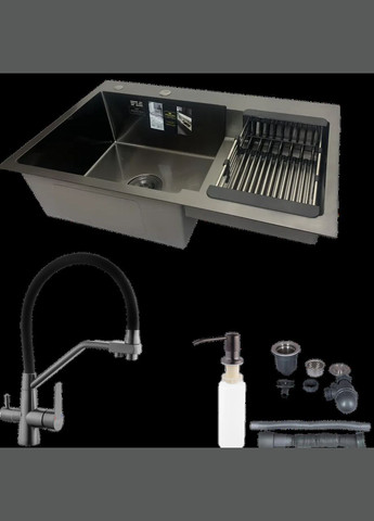 Магазин Santeh Misto радий представити для своїх покупців неймовірну пропозицію - Комплект Kroner KRP Schwarze - 7848RHM PVD - повноцінне рішення для кухні високої якості, що ідеально поєднується за кольорами та матеріалами. Набір складається з: кухонної мийки з нержавіючої сталі змішувача вбудованого диспенсера сифона, слив-переливу, кошикового вентиля, сушарки. Купівля готового комплекту – це набагато простіше, швидше та дешевше, ніж купувати окремо змішувач, мийку та дозатор. Це насамперед: 1. Гарний дизайн та ідеальна сумісність між мийкою та змішувачем. 2. Економія грошей та часу. Нержавіючі кухонні мийки Kroner серіі KRP Schwarze забезпечують максимальну свободу для дизайну кухні де Ви проводите дорогоцінні хвилини з рідними та близькими. Нержавіюча сталь - високоякісний матеріал, що поєднує в собі стильну естетику з функціональністю та безпрецедентною довговічністю. Також у ряді причин вибору на користь нержавіючої сталі є абсолютна гігієнічність матеріалу. Кухонна мийка Kroner KRP Schwarze - 7848RHM PVD виготовлена з нержавіючої сталі, яку рекомендовано використовувати в контакті з харчовими продуктами. У мийку можна сміливо ставити розпечені сковорідки. Вона з легкістю може переносити вплив окропу та пари. Матеріал здатний витримувати нагрівання до 140 °С. Характеристики мийки: Кухонна мийка Kroner KRP Schwarze - 7848RHM PVD (3.0/1.0 мм) виготовлена з нержавіючої сталі, тому виріб прослужить довгі роки. Мийка виконана у вигляді прямокутної чаші з крилом для посуду, монтується інтегрованим способом.Сучасний дизайн мийки прикрасить будь-яку кухню і дозволить задовольнити найвищі вимоги, створюючи затишок у вашому домі! Колір Чорний Матеріал Нержавіюча сталь Поверхня PVD Серія Schwarze Вид монтажу Інтегрований Висота виробу, мм 220 Глубина изделия, мм 480 Ширина виробу, мм 780 Габарити виробу, мм 840x540x270 Ширина шафи для монтажу, мм 460 Вид слива-перелива Так Гарантія 36 місяців Країна виробник Польща Комплектация Німеччина Комплектація Мийка, сифон, злив-перелив, кошиковий вентиль, сушарка. вага брутто, кг 9,3 Вага нетто, кг 6,5 Модель Schwarze-7848RHM Довжина виробу, мм 780 Глубина, мм 480 Габарити пакування, мм 840x540x270 Тип виробу Кухонна мийка Розмір основної чаші (ШхГхВ), мм 440х390х220 Товщина сталі, мм 3/1 Сифон Так Наявність чаші/ робочої поверхні (сушки) Так Висота виробу, мм 220 Глибина виробу, мм 480 Ширина виробу, мм 780 Колір Чорний Кількість чаш 1 Змішувач для кухні з підключенням до фільтра Kroner KRP Edelstahl Klassisch - PVD03817BLK - це високофункціональний та стильний санітарний пристрій, призначений для забезпечення комфорту та зручності у вашій кухні. Цей змішувач має такі ключові характеристики: Модель призначена для одночасного підключення до водопроводу та фільтру, забезпечуючи можливість використання як звичайної, так і питної води. Це зручне рішення для підтримки здорового способу життя. Силіконовий вилив забезпечує зручність при митті раковини та габаритного посуду, роблячи процес більш ефективним та комфортним. Надійна робота забезпечується керамічним картриджем діаметром 35 мм та кран-буксою з кутом повороту 90°, що спрощує регулювання потоку води та забезпечує тривалий термін експлуатації. Змішувач обладнаний зручними рукоятками для керування, що робить процес регулювання потоку води зручнішим та ергономічнішим. Аератори створюють рівномірний струмінь без бризок як водопровідної води, так питної води, 