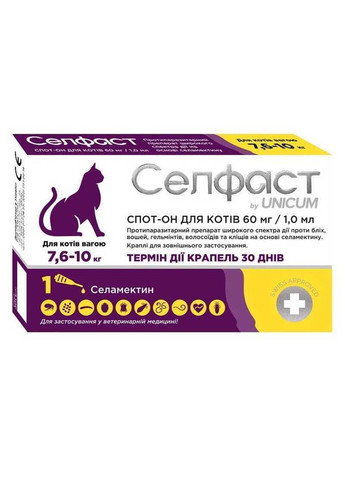 Котики норовливі створіння, що люблять часто гуляти на вулиці, лазити по деревах за пташками чи зловити мишку десь в кущах. Та з приходом весни активізуються паразити, що легко кріпляться до шерсті тварини та можуть паразитувати на її тілі. Крім того, такі паразити, як кліщі можуть нашкодити здоров'я кота, адже кліщі є переносниками такої важкої хвороби, як дирофіляріоз, яка може призвести навіть до смерті вихованця. Аби захистити пухнастика від шкідливих наслідків та зберегти його здоров'я варто подбати про нього завчасно. Каплі на холку від словенського бренду KRKA дозволить легко захистити кота від паразитів та зберегти його здоров'я. Достатньо нанести препарат на шкіру кота в основі шиї та дозволити йому ввібратися. Переваги: Швидка дія, препарат починає діяти через 2 години; Можна купати тварину вже через 30 хв, без втрати властивості засобу; Препарат легкий та простий у застосуванні; Ефективно бореться з кліщами, гельмінтами та блохами; Профілактичний засіб для запобігання зараження кота дирофіляріозом та іншими хворобами. Склад і форма випуску: Лікарська форма: розчин для зовнішнього застосування. Селафорт в формі 6% і 12% розчину в якості діючої речовини містить селамектин відповідно 60 мг / мл і 120 мг / мл і допоміжні речовини: ізопропіловий спирт, бутилгідрокситолуол, диметилсульфоксид. За зовнішнім виглядом препарат являє собою прозорий розчин від безбарвного до жовтого кольору, або від безбарвного до коричневого, або від безбарвного до коричнево-жовтого, або від безбарвного до жовто-зеленого кольору. Селафорт випускають розфасованим в полімерні піпетки різного об'єму з ковпачками різного кольору: Селафорт 6% розчин по: 0,25 мл (рожевий ковпачок), 0,75 мл (бірюзовий ковпачок), 1 мл (сіро-коричневий ковпачок); Селафорт 12% розчин по: 0,25 мл (фіолетовий ковпачок), 0,5 мл (помаранчевий ковпачок), 1 мл (червоний ковпачок), 2 мл (зелений ковпачок), 3,0 мл (темно-синій ковпачок). Піпетки упаковують по 1 штук в блістер, які поміщають разом з інструкцією по застосуванню в картонні коробки. Колір коробки і ковпачків піпеток в цій коробці однакові. Відпускається без рецепта лікаря ветеринарної медицини. Фармакологічні властивості Селафорт відноситься до протипаразитарних лікарських препаратів групи макроциклічних лактонів. Діюча речовина препарату - селамектин володіє широким спектром системної нематодоцидної, інсектицидної і акарицидної дії, активний проти нематод, комах і саркоптоїдних кліщів, що паразитують у собак і кішок, володіючи ларвіцидними і овоцидними властивостями, перериває цикл розвитку комах. Селафорт за ступенем впливу на організм відноситься до помірно небезпечних речовин (3 клас небезпеки по ГОСТ 12.1.007-76), в рекомендованих дозах не має місцевоподразнюючої, резорбтивно-токсичної і сенсибілізуючої дії, добре переноситься кішками і собаками різних порід, включаючи коллі та споріднені породи собак. Препарат токсичний для бджіл, а також для риб та інших гідробіонтів. Порядок застосування Селафорт призначають собакам і кішкам з лікувальною і профілактичною метою при ентомозах, викликаних блохами, вошами і волосоїдами, отодектозі, саркоптозі, анкілостомозі і токсокарозі, а також для профілактики дирофіляріозу. Селафорт застосовують собакам і кішкам шляхом одноразового нанесення на суху неушкоджену шкіру, використовуючи піпе