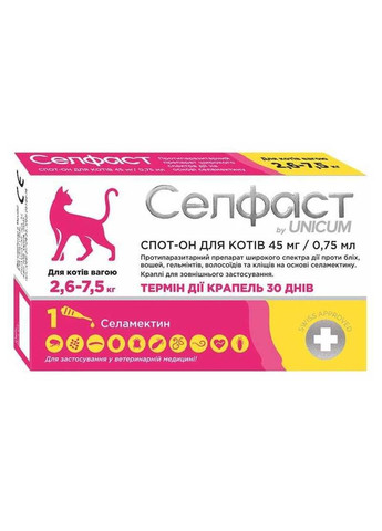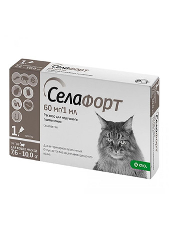 Котики норовливі створіння, що люблять часто гуляти на вулиці, лазити по деревах за пташками чи зловити мишку десь в кущах. Та з приходом весни активізуються паразити, що легко кріпляться до шерсті тварини та можуть паразитувати на її тілі. Крім того, такі паразити, як кліщі можуть нашкодити здоров'я кота, адже кліщі є переносниками такої важкої хвороби, як дирофіляріоз, яка може призвести навіть до смерті вихованця. Аби захистити пухнастика від шкідливих наслідків та зберегти його здоров'я варто подбати про нього завчасно. Каплі на холку від словенського бренду KRKA дозволить легко захистити кота від паразитів та зберегти його здоров'я. Достатньо нанести препарат на шкіру кота в основі шиї та дозволити йому ввібратися. Переваги: Швидка дія, препарат починає діяти через 2 години; Можна купати тварину вже через 30 хв, без втрати властивості засобу; Препарат легкий та простий у застосуванні; Ефективно бореться з кліщами, гельмінтами та блохами; Профілактичний засіб для запобігання зараження кота дирофіляріозом та іншими хворобами. Склад і форма випуску: Лікарська форма: розчин для зовнішнього застосування. Селафорт в формі 6% і 12% розчину в якості діючої речовини містить селамектин відповідно 60 мг / мл і 120 мг / мл і допоміжні речовини: ізопропіловий спирт, бутилгідрокситолуол, диметилсульфоксид. За зовнішнім виглядом препарат являє собою прозорий розчин від безбарвного до жовтого кольору, або від безбарвного до коричневого, або від безбарвного до коричнево-жовтого, або від безбарвного до жовто-зеленого кольору. Селафорт випускають розфасованим в полімерні піпетки різного об'єму з ковпачками різного кольору: Селафорт 6% розчин по: 0,25 мл (рожевий ковпачок), 0,75 мл (бірюзовий ковпачок), 1 мл (сіро-коричневий ковпачок); Селафорт 12% розчин по: 0,25 мл (фіолетовий ковпачок), 0,5 мл (помаранчевий ковпачок), 1 мл (червоний ковпачок), 2 мл (зелений ковпачок), 3,0 мл (темно-синій ковпачок). Піпетки упаковують по 1 штук в блістер, які поміщають разом з інструкцією по застосуванню в картонні коробки. Колір коробки і ковпачків піпеток в цій коробці однакові. Відпускається без рецепта лікаря ветеринарної медицини. Фармакологічні властивості Селафорт відноситься до протипаразитарних лікарських препаратів групи макроциклічних лактонів. Діюча речовина препарату - селамектин володіє широким спектром системної нематодоцидної, інсектицидної і акарицидної дії, активний проти нематод, комах і саркоптоїдних кліщів, що паразитують у собак і кішок, володіючи ларвіцидними і овоцидними властивостями, перериває цикл розвитку комах. Селафорт за ступенем впливу на організм відноситься до помірно небезпечних речовин (3 клас небезпеки по ГОСТ 12.1.007-76), в рекомендованих дозах не має місцевоподразнюючої, резорбтивно-токсичної і сенсибілізуючої дії, добре переноситься кішками і собаками різних порід, включаючи коллі та споріднені породи собак. Препарат токсичний для бджіл, а також для риб та інших гідробіонтів. Порядок застосування Селафорт призначають собакам і кішкам з лікувальною і профілактичною метою при ентомозах, викликаних блохами, вошами і волосоїдами, отодектозі, саркоптозі, анкілостомозі і токсокарозі, а також для профілактики дирофіляріозу. Селафорт застосовують собакам і кішкам шляхом одноразового нанесення на суху неушкоджену шкіру, використовуючи піпе