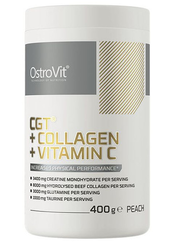OstroVit CGT + Колаген + Вітамін C це високоякісна біологічно активна добавка, яка є джерелом цінних речовин, що забезпечує організм, зокрема, колагеном, креатином або аскорбіновою кислотою. Вона доступна у зручній порошковій формі та призначена для спортсменів та людей, які хочуть доповнити свій раціон цінними сполуками. Джерело цінних інгредієнтів – одна порція дієтичної добавки забезпечує організм 8000 мг гідролізованого бичачого колагену, 3400 мг моногідрату креатину, 500 мг вітаміну С, а також 3000 мг L-глютаміну та 1000 мг таурину. 1 порція = 3 ⅓ мірної ложки = 20 г. Продуктивність – одна упаковка продукту містить 20 порцій препарату. Зручна форма – препарат доступний у порошковій формі для зручного прийому дієтичної добавки та ідеально підходить для людей, яким важко ковтати таблетки. Для цього достатньо змішати порцію продукту з водою чи соком, і все готово! OstroVit CGT + Колаген + Вітамін C - комплексне джерело цінних речовин Колаген це один з основних будівельних білків, природний полімер та важливий компонент міжклітинної речовини тварин організмів, рівень якого з віком знижується через природні процеси старіння. Гідролізований бичачий колаген, що використовується в препараті OstroVit, відрізняється дуже хорошою біодоступністю, що означає, що він легко засвоюється в системі травлення людини. Крім того, він не має характерного запаху, який іноді зустрічається у біологічно активних добавках на основі морського колагену. Креатин це хімічна сполука, яка природно присутня в організмі людини. Ця речовина може також надходити в організм із щоденним раціоном - креатин міститься в продуктах тваринного походження, таких як м'ясо, риба та яйця, а також у вигляді біологічно активних добавок. У препараті OstroVit використовують моногідрат креатину, тобто. з'єднання молекули креатину з молекулою води в одну молекулу - оскільки креатин є гідрофільним з'єднанням, він легко з'єднується з водою, утворюючи сполуку, що відрізняється чудовою біодоступністю. Вітамін C, відомий також як аскорбінова кислота, - це найважливіша органічна хімічна сполука, що відноситься до категорії водорозчинних вітамінів. Це екзогенна речовина, яку організм не може синтезувати самостійно, тому необхідне надходження сполуки в систему ззовні – інгредієнт міститься у свіжих фруктах та овочах, таких як перець, кольрабі, апельсини та чорна смородина, а також у біологічно активних добавках. Властивості інгредієнтів, що містяться в OstroVit CGT + Колаген + Вітамін C Креатин підвищує фізичну працездатність при послідовних коротких і інтенсивних тренуваннях, причому позитивний ефект проявляється при щоденному вживанні 3 г креатину. Вітамін C допомагає у правильному виробленні колагену для оптимальної роботи кровоносних судин, кісток, хрящів, ясен, а також шкіри та зубів. Крім того, ця сполука сприяє підтримці правильного енергетичного обміну та підтримує нормальну роботу нервової системи. Вітамін C допомагає захистити клітини від окислювального стресу та підтримувати оптимальну психологічну функцію, а також забезпечує правильне функціонування імунної системи. Цей інгредієнт сприяє також зниженню відчуття втоми та втоми, підвищує засвоєння заліза та допомагає відновлювати відновлену форму вітаміну Е. Крім того, вітамін С допомагає підтримувати нормальне функціонування імунної системи пі