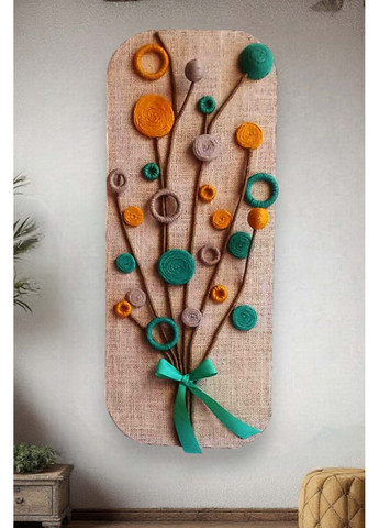Декоративна картина «букет польових квітів» – унікальне мистецтво зі шпагату Прикрасьте свій простір або зробіть особливий подарунок близькій людині з декоративною картиною «Букет польових квітів». Витончена ручна робота, яка поєднує креативність і сучасний мінімалістичний стиль. Ідеально підходить для подарунка на день народження або для створення естетичного декору у вашій кімнаті. 📐 Розмір: 65 х 26 см 🪵 Матеріал: основа – ДВП, ззаду міцна дерев’яна рамка ✨ Краї картини заокруглені 🎨 Колір полотна – молочний / світло-сірий 🌸 Квіти різних форм виконані зі джутового шпагату у відтінках голубого, гірчичного та сірого. Стебла – зі шпагату кольору хакі, перев’язані жаккардовою стрічкою голубого кольору. Ця картина стане стильним акцентом у вашому домі та чудовим подарунком, що зберігає тепло ручної роботи.