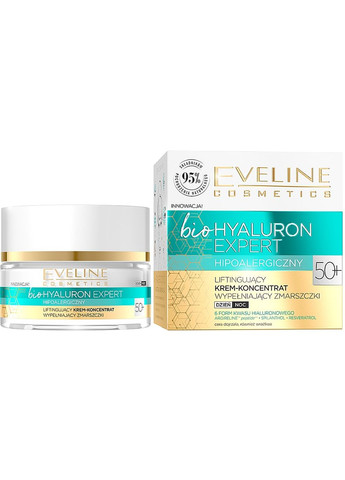 Ультразволожувальний денний і нічний крем-концентрат від польського бренда Eveline Cosmetics виконаний спеціально для зрілої шкіри 50+, адже саме вона найбільше страждає від агресивного впливу зовнішніх і внутрішніх факторів. BioHyaluron Expert забезпечує глибоке живлення і ефективне відновлення епідермісу, позбавляючи його від дрібних недосконалостей і вікових змін. Регулярне використання шовковистої консистенції здатне вирівняти тон і розгладити рельєф покриву, значно підвищуючи його захисні властивості, повертаючи гладкість, пружність, природний блиск. Особливості BioHyaluron Expert 50+ від бренда Eveline Cosmetics: - захищає шкіру від появи ознак старіння; - комплекс ACTIPEPTIDE EC значно підвищує її еластичність; - Acacia Collagen відновлює і зміцнює епідерміс; - нормалізує і підтримує його гідробаланс; - ефективно відновлює пошкоджені ділянки; - стимулює процес регенерації тканин і клітинне оновлення; - кокосова вода інтенсивно наповнює шкіру вологою; - якісно усуває ознаки дегідратації: сухість, почервоніння, подразнення; - перешкоджає утворенню дрібних недосконалостей; - чудово освіжає, тонізує і бадьорить.