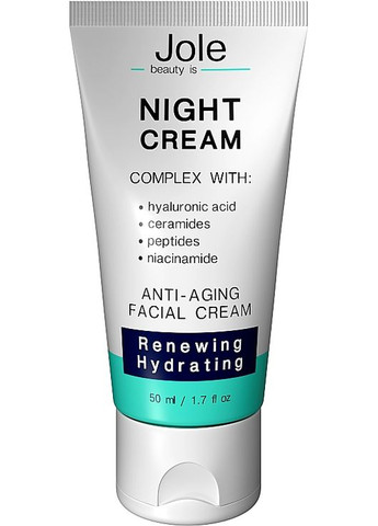 З віком наша шкіра починає потребувати ретельного догляду, і тут не обійтися без активних засобів. Бренд Jole випустив нічний крем, формула якого збагачена гіалуроновою кислотою, керамідами і комплексом пептидів. Поєднання цих компонентів позитивно впливає на шкіру обличчя і запобігає виникненню вікових змін. Оскільки вночі клітини активно відновлюються, крем допомагає прискорити регенерацію і наповнює клітини активним вітамінним комплексом. На ранок обличчя стає свіжим, підтягнутим і відпочилим. Завдяки активним речовинам крему: гіалуроновій кислоті, комплексам пептидів і керамідів, колагену, ніацинаміду, він інтенсивно і глибоко зволожує шкіру, перешкоджає втраті вологи, стимулює оновлення шкіри, розгладжує зморшки, підвищує її еластичність, заспокоює шкіру, уповільнює процес її старіння та відновлює захисний бар'єр. Особливості Night Cream Anti-Aging Facial Cream бренду Jole: - інтенсивно та пролонговано зволожує шкіру;- стимулює природне вироблення колагену;- збільшує пружність та еластичність шкіри;- розгладжує дрібні зморшки та уповільнює утворення глибоких;- усуває лущення, пом'якшує шкіру;- надає протизапальну дію, прискорює загоєння ушкоджень, подразнень;- відновлює бар'єрну функцію шкіри.