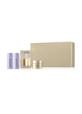 Антивіковий набір мініатюр Laneige Perfect Renew Trial Kit Склад набору: 1. Laneige Perfect Renew 3X Skin Refiner 15мл - тонер, який містить унікальне поєднання активних компонентів, таких як ретинол, пептиди та флавоноїди. Вони ефективно захищають шкіру від ознак старіння, надаючи їй свіжості та м'якості. Ектоїн та гіалуронова кислота, що входять до складу даного продукту, забезпечують глибоке зволоження шкіри та активують природні механізми її відновлення. Завдяки таурину, який також присутній у формулі, стимулюється виробництво колагену, що робить шкіру більш еластичною та пружною. 2. Laneige Perfect Renew 3X Emulsion 15мл - Антивікова емульсія допомагає підтримувати здоров'я обличчя, оживляючи зовнішній вигляд шкіри та живлячи її, а також підвищуючи еластичність та сяйво. Клінічно доведено зменшення появи тонких ліній, підвищення пружністі, сяйва, гідрокорекції та зволоження шкіри після 4 тижнів використання. Ця емульсія містить 3X TM, ключовий антивіковий інгредієнт, який миттєво надає шкірі здорове сяйво. Він також має формулу, що не містить інгредієнтів тваринного походження, мінеральних масел, синтетичних барвників, поліакриламіду, імідазолідинілсечовини, триетаноламіну та тальку. Ця емульсія має насичену та поживну текстуру, яка балансує рівень олії та вологи в сухій та старіючій шкірі. Покращує вологозахисний бар'єр та щільність шкіри, роблячи її більш пружною та еластичною. 3. Laneige Perfect Renew 3X Signature Serum 2млx3шт - Інтенсивна сироватка, що поєднує три різні сироватки в одному флаконі, які помітно розгладжують зморшки (жовта), надають шкірі пружність (біла) і сяйво (коричнева), допомагають мінімізувати ознаки видимого старіння й надають шкірі здорового сяйва. 4. Laneige Perfect Renew 3X Cream 8мл - Крем для обличчя є комплексним рішенням для боротьби з першими ознаками старіння шкіри, такими як мімічні зморшки, тьмяний колір обличчя, втрата еластичності та нерівність шкіри, набряклість, пігментація, сухість. Нова технологія Perfect Renew Water Science дозволяє доставляти в шкіру Керамідну Воду, що відновлює, яка за допомогою керамідів, відновлюючи захисний шар шкіри, усуваючи сухість і вирівнюючи поверхню шкіри та її колір.