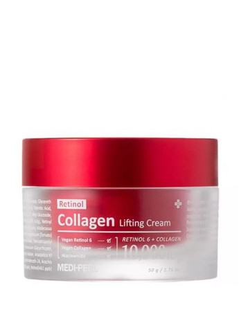 Подвійний ліфтинг-крем Medi-peel Retinol Collagen Lifting Cream: ✨ Має потужну омолоджуючу дію, розгладжує зморшки, зменшує видимість пір і підтягує, підвищуючи еластичність і пружність. ✨ Зволожує та пом'якшує, перешкоджає сухості, вирівнює тон та покращує колір обличчя. ✅ Підходить для всіх типів шкіри. Двофазний засіб складається з класичної кремової текстури, яку обволікає легкий гель: це дозволяє регулювати густину крему, змішуючи обидві консистенції. Додавати більше гелю для комбінованої та жирної шкіри, та додавати більше кремової текстури для нормальної та сухої шкіри. Відмінно підходить для будь-якого сезону. Містить Retinolgen™ – поєднання шести видів інкапсульованого ретинолу та колагену, які працюють глибоко у шкірі. 6 видів ретинолу включають: Ретиніл пальмітат - ефір вітаміну A, трансформується спочатку в ретинол, потім в ретиналь, і тільки потім ретиноєву кислоту. Чинить антиоксидантну дію, уповільнює в'янення шкіри. Ретиніл ретиноат – сучасна форма ретинолу. Запускає вироблення гіалуронової кислоти, пригнічує запальний процес, працює швидше з меншим роздратуванням. Гранактивний ретиноїд (hydroxypinacolone retinoate) – суперстабільна форма нового покоління ретинолу. Відрізняється ефективністю та швидкою дією, викликає менше роздратування. Ретиналь – потужна форма вітаміну A, одразу трансформується у ретинову кислоту. Чинить антивікову дію, стимулює оновлення клітин. Ретинол - найпоширеніший вид ретиноїдів, що трансформується в ретиналь, потім ретиноєву кислоту. Чинить антивікову дію. Сибілін – рослинна речовина, яка видобувається з екстракту розторопші (Sílybum Marianum). Має сильну антиоксидантну дію, пригнічує процес запалення і зменшує руйнування, викликане УФ-променями. Комплекс ретиноїдів – активів із доведеною ефективністю – запускає процес клітинного оновлення, за рахунок чого розгладжує текстуру шкіри, зменшує зморшки, нормалізує вироблення себуму та висвітлює пігментацію. Гідролізований колаген у складі зволожує, запобігає сухості, утримує вологу. Крем має міжнародний сертифікат V-Label®, який підтверджує, що склад крему є веганським: не містить компонентів тваринного походження. Додаткові компоненти, що діють: Екстракт ієрохонської троянди глибоко живить, зволожує і відновлює. Має антиоксидантну дію, яка запобігає руйнуванню клітин і уповільнює процеси старіння. Redsnow - антивіковий комплекс, створений на основі екстракту японської камелії, що росте на острові Чеджу, Корея. Redsnow підвищує вироблення колагену, пригнічує гени MMP-1, що стимулюють розпад молекул колагену, та блокує рецептори, які запускають процес окислення клітин. MadeWhite™ – комплекс, що складається з мадекасосида, похідного центелі азіатської, та пентилену гліколю. Пригнічує вироблення ферменту циклооксигенази, що регулює запальну реакцію, тим самим запобігає запаленню та слідам від акне. Green Tomato SE – зміцнюючий антивіковий комплекс на основі екстракту зеленого томату. Стимулює вироблення колагену і запускає процес ремоделювання тканин, за рахунок чого має антивікову дію. Пантенол (вітамін B5) прискорює загоєння, заспокоює та знімає роздратування, відновлює цілісність епідермісу. Ніацинамід (вітамін B3) освітлює пігментацію та запобігає її появі, нормалізує вироблення себуму, зменшує блиск у Т-зоні (лоб, ніс, щоки та підборіддя), підвищує захисні функції шкіри. Ціанок