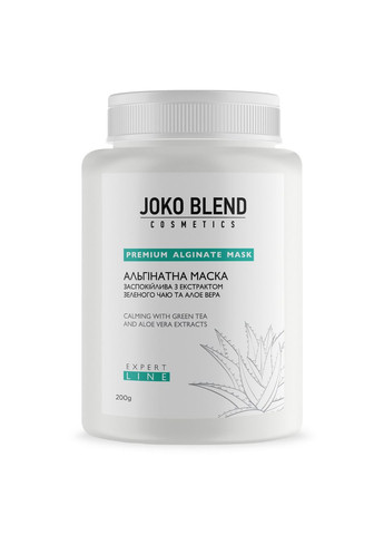 Альгінатна маска з екстрактом зеленого чаю і алое вера Joko Blend рекомендується для сухої, чутливої ​​шкіри, схильної до висипань і подразнень. Має заспокійливу і протизапальну дію. Маска знімає запалення і почервоніння, очищає пори, зволожує шкіру. Як правильно наносити альгінатну маску? Важливо наносити альгінатну маску швидко і розводити її водою кімнатної температури! Шпателем нанести маску на обличчя, включаючи очі і губи. Накладайте маску товстим шаром, вона повинна надавати прямий тиск на шкіру. Маска повністю застигає за кілька хвилин. Наступний етап - пластифікація, маска стає схожа на гуму, схоплюється і фіксується. Новоутворена маска сприяє глибокому проникненню корисних елементів і зволоженню шкіри. Перед нанесенням маски для більш ефективного впливу можна нанести сироватку або емульсію. Маска знімається одним рухом, від підборіддя до чола. Залишки маски змийте водою. Нанесіть на обличчя зволожуючий крем. Активні компоненти Альгінат натрію - це натуральний морський полісахарид з бурих і червоних водоростей. Альгінат натрію сприяє зміцненню колагенових клітин, регулює водний баланс шкіри, утримує вологу, посилює активність живлення шкіри і обмін речовин. У складі альгінатних масок альгінат допомагає нормалізувати жирність шкіри, звужує пори, сменшує зморшки, тонізує і покращує мікроциркуляцію, виводить токсини. Вітамін A відновлює еластичність, пружність і міцність волосся. Захищає від дії ультрафіолету. Зміцнює волосяні цибулини, стимулює ріст нового волосся. Живить і зволожує, перешкоджає появі посічених кінчиків. Ретинол (вітамін А) має масу важливих функцій в організмі людини. Є дієвим антиоксидантом, підтримує роботу органів зору і міцного імунітету. Має яскраво виражені протизапальні властивості, омолоджуючу дію, зменшує вираженість пігментних плям, вирівнює рельєф і тон шкіри. Суха шкіра стає більш зволоженою і еластичною. Вітамін Е - група з'єднань, що включає в себе токофероли і токотрієноли. Для виготовлення натуральної косметики використовується токоферол - важливий антиоксидант, який бере участь в процесах метаболізму на клітинному рівні, роблячи шкіру м'якою і еластичною. Зволожує кутикулу, перешкоджає появі тріщин. Відновлює пошкоджені і слабкі нігті. Перешкоджає розшаруванню, прискорює ріст нігтів. При постійному використанні допомагає підтримувати здоров'я нігтів і кутикули. Відновлює структуру вій і брів, активізує ріст нових волосків. Має живильну дію, захищає від негативних зовнішніх факторів, зокрема, від ультрафіолету. Відновлює здоровий блиск волосся, перешкоджає його ламкості. При постійному використанні захищає від появи посічених кінчиків. Зволожує шкіру голови, м'яко бореться з лупою. Діатомова земля видобувається з діатомових водоростей морського або прісноводного походження. Діатоміт дбайливо відлущує ороговілий епідерміс, глибоко очищає пори і вирівнює загальний рельєф шкіри, діє як ефетивний абсорбент. Крім того, діатомова земля сприяє лікуванню запальних процесів шкіри, акне, прискорює регенерацію епідермісу, бере участь в синтезі колагену, еластину і гіалуронової кислоти. Спосіб застосування Висипати 20 г маски в окрему суху ємність. Додати 50-60 мл води 20 - 25 градусів. Ретельно перемішати до однорідної консистенції. На очищене обличчя нанести за допомогою шпателя (п
