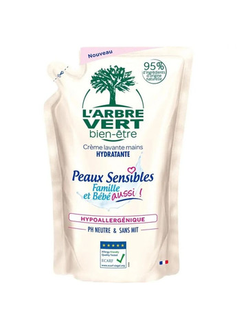 Крем-мило для рук L'Arbre Vert Чутлива шкіра підходить для всієї родини. Основні переваги: ідеально підходить для людей та дітей з чутливою шкірою, схильною до проявів алергії робить шкіру рук ніжною та зволоженою дарує приємний, свіжий аромат солодкого мигдалю на 95% складається із компонентів натурального походження має сертифікат EU Ecolabel, що підтверджує екологічний склад та безпеку для навколишнього середовища гіпоалергенна формула, що не викликає алергічних реакцій, нейтральний PH для шкіри не містить продукти тваринного походження, не тестується на тваринах 100% пакування, що переробляється Спосіб застосування: нанесіть на вологі руки необхідну кількість рідкого мила, спіньте та ретельно промийте руки водою. Характеристики Об'єм: 300 мл Виробник: L'Arbre Vert, Франція.