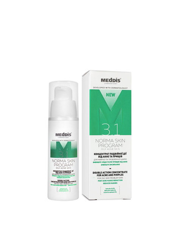 Засіб проти акне та прищів Meddis Norma Skin подвійної дії для жирної шкіри обличчя Засіб подвійної дії Meddis — ваш помічник у боротьбі з акне та недосконалостями шкіри! Формула концентрату ефективно зменшує висипки та усуває сліди постакне, даруючи вашій шкірі шанс мати ідеальний вигляд. З кожним застосуванням ви помічаєте, як прищів стає менше, а шкіра стає гладкою, сяйною й рівною. Забудьте про коригувальні засоби та тональні креми — тепер ваша шкіра прекрасна та без них! Концентрат Meddis підходить для дорослих і підлітків віком від 10 років. Дієві інгредієнти, які піклуються про вашу шкіру: Арбутин 0,5%. Має освітлювальний та антиоксидантний ефект. Допомагає усунути сліди постакне, зволожує шкіру, зміцнює судини та вирівнює її тон. Саліцилова кислота 1%. Потужний антисептик, який очищає пори, зменшує їх розмір і згладжує рельєф шкіри. Екстракт солодки 1%. Натуральний освітлювальний компонент, покращує колір обличчя, бореться з пігментацією й запобігає її появі. Яких результатів ви досягнете з концентратом Meddis: зниження запалень і висипань; рівний тон і розгладжені рубці; контроль жирного блиску; профілактика нових висипань. Подаруйте своїй шкірі шанс на оновлення! Забудьте про недосконалості — зустрічайте сяйливе й оксамитове обличчя з Meddis! Спосіб застосування: Очистьте обличчя водою й ретельно висушіть. Використовуйте засіб тільки ввечері. Вранці обов'язково наносьте SPF-крем. Рекомендований курс: 4-6 тижнів. Об'єм: 30 мл
