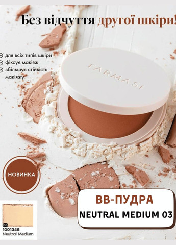 Ця збагачена скваленом BB-пудра «все в одному» бездоганно приховує недоліки шкіри та надає ніжний зволожуючий ефект. Закріплює макіяж, гармонізує тон шкіри, робить колір обличчя однорідним та оксамитовим. Всі типи шкіри. За допомогою BB-пудри Farmasi ти зможеш створити ідеальне макіяж з приємним відтінком. Вона містить сквален та інші цінні олії, які допомагають зволожувати та живити шкіру, запобігають сухості та відчуття стягнутості. Завдяки насиченому складу пудра не сушить і не підкреслює лущення і дрібні зморшки, робить шкіру бархатистою і шовковистою на дотик. BB-пудра Farmasi відмінно маскує недосконалості, усуває темні кола та плями, надаючи шкірі рівномірного тону. Закріплюючи макіяж, вона забезпечує довготривале свіже та натуральне покриття протягом усього дня. BB-пудра Farmasi має дуже зручну упаковку з повноцінним дзеркальцем, що дозволяє легко і швидко наносити її незалежно від часу і місця. Поверхня пудри трохи сяюча, делікатно підсвічує тон шкіри і робить його свіжішим і молодішим. Тому, якщо ти хочеш виглядати чудово в будь-який час доби і доглядати свою шкіру одночасно, то BB-пудра Farmasi стане для тебе ідеальним вибором! З нею твій макіяж буде бездоганним та природним, а шкіра вдячна за зволоження та захист від шкідливих факторів навколишнього середовища. Інструкція по застосуванню Пудру нанести пензлем або спонжем безпосередньо після зволожуючого або тонального крему на область обличчя і шиї. Склад: Talc, Mica, Synthetic Fluorphlogopite, Silica, Octyldodecyl Stearoyl Stearate, Dimethicone, Magnesium Stearate, Octyldodecanol, Squalene, Phenoxyethanol, Ethylhexylglycerin, Triethoxycaprylylsilane. [+/- May Contain: Titanium Dioxide/CI 77891, Iron Oxides/CI 77491, CI 77492, CI77499.]