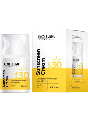 Сонцезахисний крем для обличчя Joko Blend SPF 30 допомагає захистити шкіру обличчя від сонячних опіків, почервоніння та інших пошкоджень шкіри, спричинених ультрафіолетом. Особливості: засіб містить фотостабільні хімічні фільтри нового покоління, які забезпечують захист широкого спектра від UVA та UVB променів; сонцезахисний крем має легку текстуру, не залишає білих слідів та липкості, некомедогенний; підходить для всіх типів шкіри. Спосіб застосування: нанести сонцезахисний крем за 10-20 хвилин до виходу на вулицю. Наносити повторно через кожні 2-3 години протягом дня, якщо перебуваєте на активному сонці. Використовувати для щоденного застосування як останній етап у догляді.
