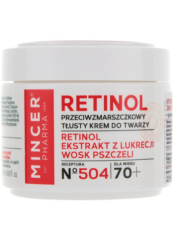 Високоефективний крем Retinol № 504 бореться з усіма ознаками старіння і в'янення шкіри на рівні ДНК, зменшує глибокі зморшки. Його унікальна формула розроблена фахівцями компанії Mincer спеціально для догляду за зрілою шкірою, що вимагає інтенсивної регенерації. Крем містить ретинол, який володіє високою відновлювальною дією, забезпечує захист від вільних радикалів, покращує структуру шкіри шляхом активізації оновлення епідермісу. Крем перешкоджає подальшому в'яненню шкіри, зменшує пігментацію, зміцнює тургор й оживляє шкіру. Він збагачений екстрактом кореня солодки, який глибоко живить і зволожує шкіру, тонізує, надає потужний anti-age ефект. Крем стане прекрасним подарунком для жінок від 70 років і дасть змогу значно вповільнити процес старіння. Спосіб застосування: нанести на очищену шкіру обличчя масажними рухами до повного поглинання.