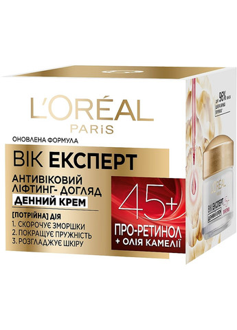 Ліфтинг-догляд ""Вік Експерт 45+"" від L'Oreal Paris розроблений спеціально для догляду за шкірою після 45 років. Він активно бореться з проблемами, що виникають у цьому віці. До складу крему входять ретино-пептиди, які: • Зменшують зморшки • Відновлюють пружність • Підтягують контури обличчя ПРО-ретинол А стимулює регенерацію клітин шкіри епідермісу. Кофеїн посилює мікроциркуляцію та природний дренаж шкіри. В результаті, тонус шкіри повертається, контури стають чіткішими, а зморшки зменшуються.