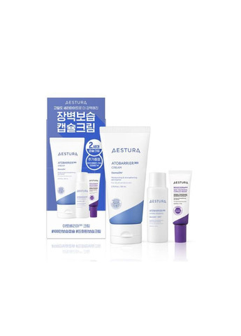 У набір входить: Atobarrier 365 Cream 80 ml Atobarrier 365 Hydro Essence 25 ml Regederm 365 Skin Tightening Capsule Serum 7 ml 1) Cream - крем для особи з церквами, які відповідає за відновлення захисного бар'єру і заспокоюють роздратування. До складу також входить манітол, який прискорює процес регенерації епідермісу і заспокоює запалення. Засіб ефективно зволожує шкіру і підвищує її стійкість до зовнішніх факторів завдяки вмісту сквалану і холестеролу. AESTURA - Atobarrier 365 Активні компоненти: цераміди — відновлюють захисний бар'єр шкіри, зволожують і заспокоюють подразнення, холестерол - відновлює природний гідроліпідний бар'єр шкіри, підвищує рівень зволоження шкіри, підтримує процеси відновлення та регенерації, сквалан - зволожує і живить шкіру, підвищує проникність активних компонентів у шкіру, манітол має регенеруючу і поживну дію, додатково заспокоює подразнення. Спосіб використання: Нанести крем на очищену та тонізовану шкіру обличчя. 2) Atobarrier 365 Hydro Essence - зволожуюча есенція для особи зі скваланом, який зволожує, живить і регенерує шкіру. До складу засобу входить манітол, який живить, регенерує епідерміс і заспокоює подразнення, а сечовина та аргінін додатково зволожують, додатково пом'якшують і розгладжують шкіру. Продукт рекомендований всім типів шкіри. 3)Сироватка Regederm 365 Skin Tightening Capsule Serum - одночасно укріплює еластичність шкіри і її бар'єр, роблячи її здоровою і пружною. Містить 105 000 PPM Derma Tightening Barrier CapsuleTM для одночасного зміцнення бар'єру та еластичності шкіри. Містить 10% вітаміну B3 для звуження пір.