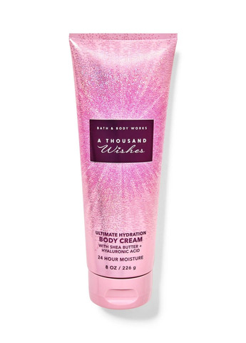 Крем для тіла A THOUSAND WISHES Bath&Body Works, 226 г Має нежирну насичену формулу, яка миттєво вбирається, забезпечуючи шкірі цілодобову живильну вологу та приємний аромат. Аромат: рожеве просеко, грайлива айва, кришталева півонія, золота амбра та крем амаретто