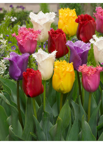 Ці тюльпани точно впізнають всі ще здалеку! Мікс Оторочених тюльпанів - це без перебільшень ціле свято на вашій садовій ділянці! Кожна квітка - унікальна та неповторна, кожна пелюстка має тонку зубчасту кайму, яка часто нагадує кришталь або іній на ранковому сонці. А під час цвітіння на клумбі створюється відчуття, ніби пелюстки оздоблені вручну — настільки вони витончені та декоративні. Цвітуть оторочені тюльпани у середній або пізній період весни, коли більшість ранніх сортів уже відійшла. Кожна квітка тримає форму досить довго, а щільна структура пелюсток робить їх стійкими до вітру, дощу та різких температур. Висота залежить від сорту, але зазвичай — від 40 до 55 см. Такі тюльпани добре почуваються у відкритому ґрунті, чудово виглядають у бордюрних посадках, міксбордерах і в контейнерах, а ще — вони незамінні в зрізці: особливо в поєднанні з однотонними сортами або ніжною зеленню. Пам’ятайте, що сортовий склад міксу може змінюватися — ми підбираємо тільки найякісніші та найсвіжіші цибулини, які доступні на момент збору. Але незалежно від комбінації, ви завжди отримаєте вражаюче цвітіння: фактурне, декоративне й дуже впізнаване. Тож сміливо купуйте - та створюйте свій сад мрії вже цього сезону! Оторочені (торочкуваті) тюльпани - це новинка серед родини тюльпанів, на яку просто неможливо не звернути увагу. Цієї ефектності їм надають голкоподібні “колючки” на пелюстках, які чимось нагадують бахрому або морозні кристали на вікні взимку. Вони досить стійкі до різноманітних погодних умов і характеризуються тривалим декоративним цвітінням, а тому для тих, хто хоче екзотичної краси без особливих зусиль - це ідеальний варіант. Ідеальні умови для вирощування: висаджувати цибулини тюльпанів найкраще восени, орієнтовно це вересень - початок жовтня. Глибина посадки — приблизно 15–20 см (від основи цибулини), а для довговічних сортів — до 30 см. Відстань між рослинами — 10–15 см. У кожну лунку варто додати жменю компосту або спеціального добрива для цибулин — це допоможе молодим корінцям швидше прижитися. Садіть верхівкою догори, а якщо не впевнені — боком: природа сама розбереться. Тюльпани люблять сонце та легкий, добре дренований ґрунт. Найгірше, що може з ними статися — це волога ділянка: там цибулини швидко загнивають. Тому обирайте місце, де не застоюється вода, і де рослини отримають щонайменше 6 годин сонця на день. Після цвітіння не поспішайте обрізати листя — саме воно накопичує поживні речовини для нових цибулин. Видаліть лише квітконоси, щоб рослина не витрачала сили на насіння. Листя має дозріти протягом 6 тижнів. Підживлюйте навесні або восени добривом із низьким вмістом азоту, компостом або перепрілим гноєм — тюльпани віддячать за це щедрим цвітінням.