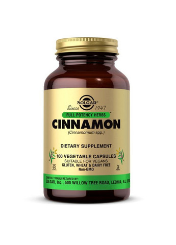 Solgar Full Potency Herbs Cinnamon - натуральна рослинна харчова добавка, що містить екстракт кори коричного дерева. Є сильним антиоксидантом та регулює роботу шлунково-кишкового тракту. Кориця - це не тільки улюблена багатьма ароматна спеція, але й справжній лікарський засіб, за допомогою якого можна значно покращити своє здоров `я, а саме роботу шлунково-кишкового тракту та запобігти захворюванням серця або діабету. Екстракт кориці виробляється з кори коричного дерева, яке має антивірусні властивості, містить у своєму складі олії, дубильні речовини, евгенол, смолу, коричневий альдегід, крохмаль. Як приймати: Як харчова добавка для дорослих приймайте по одній (1) рослинній капсулі на день, бажано під час їжі або за призначенням лікаря. Вміст елементів у 1й порції 1 вегакапсула Екстракт кориці (4:1) (Cinnamomum spp.) (кора) 300 мг Порошок кориці (Cinnamomum burmannii) (кора) 200 мг Інгредієнти Рослинна целюлоза, рослинний магнію стеарат, діоксид кремнію. Виробник: Solgar; Форма випуску: Вегакапсули; Кількість в упаковці, шт: 100; Кількість порцій, шт: 100; Зміст порції: 1 вегакапсула; Тип: Кориця; Пол: Жіночий, Чоловічий; Вікова категорія: Дорослі; Країна виробника: США; Призначення: Антиоксиданти, Для активного довголіття, Для імунної системи, Для травлення