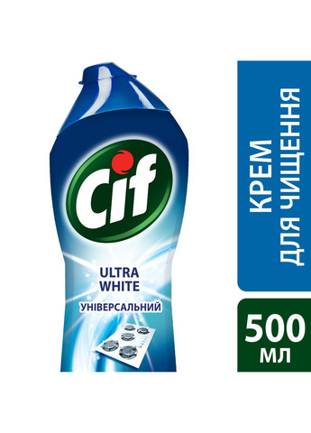 Крем для чищення "Ультра Вайт" CIF Ultra White допомагає досягти сяючої білизни у вашому будинку. Формула з посиленим відбілювальним компонентом допомагає впоратися з мильним і вапняним нальотом, іржею та пліснявою у ванній кімнаті.Засіб також ефективно бореться із залишками їжі, що пригоріли, плямами від чаю кави і вина на кухні.