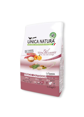Повнораціонний корм для котів суперпреміум класу — Unica Natura. Unica Natura — це натхненне природою універсальне харчування протягом всього життя від кошеняти до дорослого кота. Для виготовлення кормів використовують тільки високоякісну свіжу сировину, яка закуповується у фермерів неподалік заводу GHEDA та проходить суворий відбір та аналізи. Лінійка Unico Outdoor - це корм розроблений для кошенят та котів, що проводять час переважно гуляючи на вулиці. UNICO OUTDOOR з качкою, рисом та апельсинами. • Для кошенят, що гуляють на вулиці • Для дорослих котів та котам похилого віку • Для котів, котрі проводять час переважно на вулиці • Схильним до утворення шерстяних грудок для їх виведення • Для покращення стану шерсті у котів, котрі живуть або гуляють на вулиці • До складу входять дегідратовані водорості (містять Таурин), що позитивно сприяє на роботу мозку та зору у кошенят та молодих тварин Склад: дегідратований качиний білок (12,5%*), кукурудзяний білок, кукурудзяне борошно фіорето, рис (10%), дегідратований курячий білок, курячий жир, гідролізований тваринний білок, дегідратований свинячий білок, горохова клітковина, свіже м'ясо качки (4%), кукурудза, дегідратований лососевий білок, пивні дріжджі, м'якоть апельсина (1%), насіння льону (1%), яйця, насіння плантаго (0,5%), дегідратовані водорості, глюкозамін , новозеландська зеленогуба мідія (0,05%). *еквівалентно 34% регідратованої качки. Аналітичний склад: Сирий протеїн 40,00%; сира клітковина 3,60%; сирий жир 16,50%; сира зола 7,80%. Харчові добавки ( на 1 кг): Вітамін А 21.600 МО; Вітамін D3 1.620 МО; Вітамін Е 650 МО; Вітамін С 300 мг; Таурин 2. 015 мг; Купруму (ІІ) сульфат пентагідрат 61,90 мг (Купруму 15,75 мг); Цинку оксид 111,60 мг (Цинку 90,00 мг); Заліза (ІІ) карбонат 326,03 мг (Заліза 157,50 мг); Мангану (ІІ) оксид 40,64 мг (Мангану 31,50 мг); Кальцію йодат безводний 2,77 мг (Йод 1,80 мг); Натрію селеніт 0,49 мг (Селен 0,23 мг).