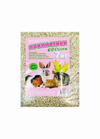 Наповнювач Пушистики ECOcorn кукурудзяний для гризунів - гіпоалергенна гігієнічна підстилка для гризунів. Ідеально підходить для вихованців страждаючих алергією на хвойні та інші наповнювачі. Використовується як підстилка для клітин дрібних тварин: кроликів, морських свинок, дрібних гризунів, папуг, рептилій, тхорів та інших. 100% натуральний екологічно чистий продукт. Складається на 100% з висушених стрижнів качанів кукурудзи, подрібнених до розміру дрібної фракції (близько 2 - 4 мм), без додавання будь-яких домішок. Швидко поглинає вологу та нейтралізує сторонні запахи. Не містить пилу, підлягає компостуванню, більш важкі гранули, ніж у звичайному наповнювачі деревини, виключають прилипання до лапок і вовни тварин утилізується в каналізацію. Не забиває побутові туалети і легко утилізується в компостних ямах, перетворюючись на органічне добриво. Спосіб застосування: Наповніть чистий та сухий лоток вмістом упаковки шаром 2 см. Тверді екскременти видаляються лопаткою. Кожні 10-15 днів, у разі неприємного запаху повністю замінити наповнювач у лотку. Використаний наповнювач частинами можна змивати у каналізацію. Упаковка: 10 штук по 2,5 літри Виробник: Україна.