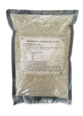 Білий кунжут - це насіння рослини sesam. Найчастіше насіння кунжуту використовують як приправу до салатів, страв з риби, птиці, а також у кондитерських виробах. Також з нього виготовляють пасту (урбеч), халву, олію, молоко.Кунжут - цінна олійна рослина. уУ насінні міститься до 60% масла, у складі якого переважають ненасичені вищі жирні кислоти – лінолева, стеаринова, арахісова, лігноцеринова – важливі складові мембран клітин. Окрім того, олія містить безліч біологічно активних речовин та вітамінів (каротин – попередник вітаміну А; вітаміни В1, В2, РР (11,1 мг) та токоферол – попередник вітаміну Е (2,3 мг)Чорний кунжут є також джерелом мікро- та макроелементів: кальцію (1474 мг), фосфору (720 мг), калію (497 мг), магнію (540 мг), заліза (16 мг), цинку міді, селену, молібдену. Білок кунжуту багатий на незамінні амінокислоти (триптофан, гістидин).Склад: кунжутне насіння 100%