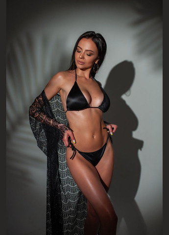 Цей комплект створений для тих, хто хоче виглядати елегантно та впевнено на пляжі або біля басейну. Класичний чорний купальник з акцентом на високу талію візуально подовжує ноги та підкреслює силует. Верх на зав'язках чудово тримається та підходить до різних типів фігури. Легка сітчаста накидка надає образу шарму напівпрозора, має широкі рукави і злегка укорочений крій. Розмір: - S маркування 70-75ВС, трусики ПРО 86-94 см - M маркування 75-80ВС, трусики ПРО 92-100 см Довжина накидки 37 см, ширина 49 см, довжина рукава 57 Склад: Купальник – 80% поліамід, 20% еластан, Накидка – 100% поліестер