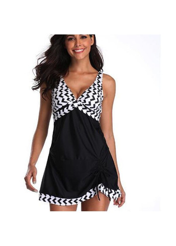 Купальник жіночий роздільний сукня і шорти чорний з білим великого розміру Жіночий купальник роздільний сукня і чорні шорти з білим великого розміру. Сукня подовжена. Верх у чорно-білий геометричний принт, також знизу є така ж вставка. У зоні бюсту V образний виріз. Ліф зі знімними поролоновими вставками. На спині бретелі кріпляться до майки за допомогою металевих гачків. Довжину бретель можна регулювати. Знизу ліворуч на сукні є невелика розпірка, а також шнурки, за допомогою яких можна регулювати довжину сукні в зоні розпірки. Низ купальника - трусики шорти чорного кольору. Передня частина на підкладці. Тканина добре тягнеться. Купальний костюм такого крою чудово маскує недоліки фігури. Склад: 82% поліамід, 18% поліестер. Колір чорний Розміри: S, M, L, XL, 2XL, 3XL, 4XL, 5XL Параметри: S: чашка - A-B, довжина сукні по спині - 49см, обхват під грудьми - 70-75см, обхват грудей - 82 - 87см, обхват стегон - 87-92 см. M: чашка - B, довжина сукні по спині - 50см, обхват під грудьми - 75-80см, обхват грудей - 87-93см, обхват стегон - 92-97 см. L: чашка - В-C, довжина сукні по спині - 52см, обхват під грудьми - 80-85см, обхват грудей - 93-98см, обхват стегон - 97-103 см. XL: чашка - C, довжина сукні по спині - 55см, обхват під грудьми - 90-95см, обхват грудей - 98-103см, обхват стегон - 103-109 см. 2ХL: чашка - С-D, довжина сукні по спині - 56см, обхват під грудьми - 95-100 см, обхват грудей - 103-109см, обхват стегон - 109-115 см. 3ХL: чашка - D, довжина сукні по спині - 57 см, обхват під грудьми - 100-105см, обхват грудей - 109-115см, обхват стегон - 115-120 см. 4ХL: чашка - D-Е, довжина сукні по спині - 61см, обхват під грудьми - 110-115см , обхват грудей - 120-126см , обхват стегон - 125- 135 см. 5ХL: чашка - Е, довжина сукні по спині - 63см, обхват під грудьми - 115-120см , обхват грудей - 126-132см , обхват стегон - 135- 145 см. Можливі розбіжності у параметрах на 1-3см.