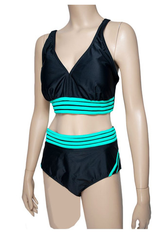 Спортивний купальник великого розміру з еластичною підкладкою Купальник великого розміру у спортивному стилі від виробника Samegame — ідеальний вибір для жінок, які шукають комфорт і підтримку в стильному виконанні. Роздільний костюм чорного кольору має блакитні вставки по низу ліфа та поверху плавок. Смужки розбавляють забарвлення та мають гарний вигляд на засмаглому тілі. Пляжний одяг створений спеціально для жінок з пишними формами, які хочуть виглядати стильно і відчувати себе комфортно під час плавання або активного відпочинку. Розділовий купальник великого розміру – особливості Основні характеристики жіночого купальника великого розміру: Чашка — м'яка зі знімними поролоновими вкладками, забезпечує природний вигляд і комфорт. Є бічні кісточки для додаткової підтримки. Бретелі — незнімні та регульовані, що дає змогу ідеально підганяти ліф під ваші параметри. Плавки — повністю на підкладці (перед і зад), з посадкою вищою за стандартну, що забезпечує додатковий комфорт та підтримку. Матеріали — 82% поліаміду, 18% еластану, швидко сохне, не втрачає форму і стійкий до впливу хлору. Модель чудово сидить на різних типах фігури, ідеально підходить для розмірів грудей D, Е. Стильний чорний колір робить його універсальним для будь-якої ситуації — хай то плавання в басейні чи відпочинок на пляжі.