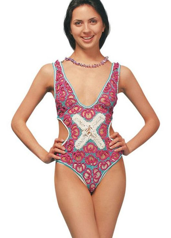 Купальник рожевий в'язаний у техніці ірландського мережива мережива. Тип моделі цього купальника — пландж. Ліф і трусики такої моделі з'єднують між собою широка смужка тканини або складне сплетіння тасьм. Крім того, монокіні поряд із планджем, — одні з найкращих варіантів для вечірніх пляжних убрань у поєднанні з парою та пляжними спідницями.