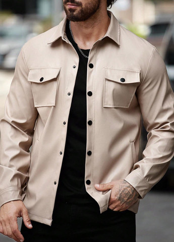 Чоловіча куртка-сорочка – повсякденна сорочка на осінь. Куртка-сорочка має однотонний дизайн із довгими рукавами. Має стандартний крій та однобортну планку з гудзиками. Куртка-сорочка включає накладні кишені. Тканина не тягнеться, має стандартну форму подола та комір сорочки.