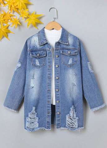 Джинсова куртка для дівчаток. Ця куртка вільного крою з необробленим подолом та розривами. Вона включає гудзики, кишені та звичайні рукави. Тканина не тягнеться, має комір та однобортну планку.
