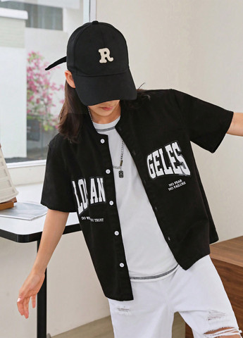 Джинсова куртка SHEIN Tween для хлопчиків. Ця повсякденна джинсова куртка-сорочка має круглий виріз горловини та короткі рукави. Застібка на ґудзики спереду та класичний крій. Куртка чорного кольору.