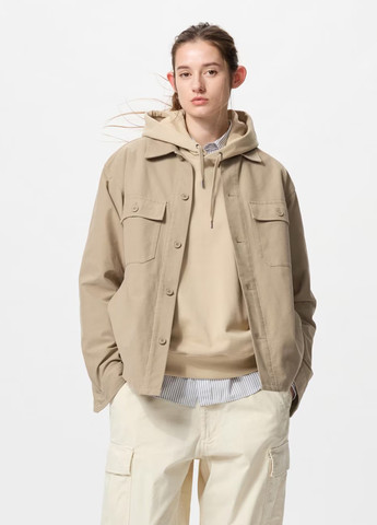 Модель має вільний крій з приспущеними рукавами та заокругленим низом, що забезпечує комфорт і легкість руху. Спереду розташовані дві нагрудні кишені та дві бокові, додаючи практичності та функціональності. Комір-відкладний, виконаний з основної тканини, як і манжети рукавів, що підкреслює стильний і завершений вигляд.