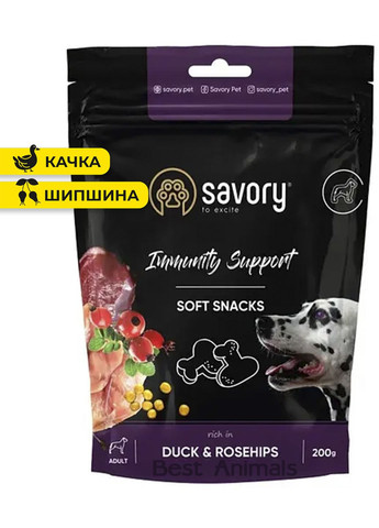 М'які ласощі Savory для дорослих собак усіх порід. Додаткове харчування, яке можна використовувати у якості заохочення та, як винагороду для улюбленця. Не тільки висока смакова привабливість, але й корисні складові, що є основою здорового харчування, роблять ласощі Savory ідеальним доповненням до основного раціону і частуванням для вашого улюбленця. Качка – цінне джерело макро- та мікроелементів, багате на вміст калію, має велику користь для роботи серця і нервової системи. Добре підходить улюбленцям чутливим до тваринних білків. Шипшина – має у своєму складі велику кількість вітаміну С, який не тільки зміцнює імунітет, але і є потужним антиоксидантом. Ромашка – дуже корисна лікарська рослина, нормалізує травлення, зміцнює імунну систему, та має протизапальну дію. Переваги: М’яка текстура дозволяє розламувати та ділити снеки, тому можна легко застосовувати їх для частування мініатюрних порід собак. Беззерновий склад ласощів ідеально підійде улюбленцям, що мають алергії на глютен, клейковину, злакові зернові культури, тощо. Не містять штучних барвників, підсилювачів смаку та аромату Екстракти лікарських і корисних рослин мають накопичувальний ефект, тому краще за все, для отримання повного спектру користі від ласощів, використовувати їх на постійній основі для заохочування і частування улюбленців. Склад: Качиний протеїн 26%, жовтий горох, рослинні жири, гарбуз, курячий протеїн 8%, гідролізована куряча печінка 5%, колаген 4%, горохове борошно, сушена шипшина 1%, сушена ромашка 0.5% Аналітичний склад: Сирий протеїн 29.0%, сирий жир 4.0%, сира зола 5.3%, сира клітковина 1.9%, вологість 17.0%, кальцій 0.7%, фосфор 0.6%, натрій 0.2%, омега-3 жирні кислоти 0.10%, омега-6 жирні кислоти 0.40% Харчові добавки на 1 кг: Вітамін С (3а312) 500 мг Енергетична цінність: 3,120 ккал/кг Вага улюбленця Норма снеків (штук на день) до 10 кг 10 10 кг 10-15 15 кг 15-20 20 кг 20-25 25 та більше кг 25-30 *дотримуйтесь норм годування, аби не перебивати апетит, та не перегодовувати улюбленця