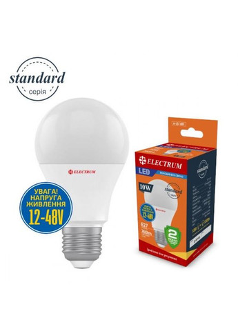 Світлодіодна лампа низьковольтна ELECTRUM 10W 12-48V E27 4000K A-LS-1891 розроблена для промислового застосування і не призначена для побутової електромережі. Ці лампи використовуються у промислових світильниках з універсальним цоколем типу E27 у приміщеннях з підвищеними вимогами до електробезпеки (місця з високою вологістю). Світловий потік цих ЛЕД лампочок становить 760 lm, а колірна температура - 4000 за Кельвіном, що забезпечує рівне і м’яке жовтувато-біле світло на виробництві або на складі. Колба має стандартну грушоподібну форму та опалове скло. Кут розсіювання ламп цієї моделі дуже значний і становить 270 градусів, завдяки чому добре висвітлюється вся робоча площа. Габарити лампочок при цьому компактні: 110 на 60 мм. Характеристики: Цоколь: E27 Потужність споживання: 10 W Напруга: 12-48V Діммінг: немає Яскравість світіння: 760 lm Кольорова температура: 4000K Розсіювач: матовий Кут розсіювання світла: 270° Розмір (висота x діаметр): 110 мм х 60 мм Колір: Білий Розмір (ШхВхГ): - Smart-управління: немає Wi-Fi: немає Bluetooth: немає ZigBee: немає Кількість у комплекті: 1 шт. Датчик руху: немає Регулювання температури світла: немає Пульт управління: немає Режим зміни кольорів: немає Гарантія, міс: 12