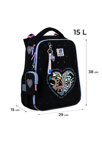 Ортопедичний рюкзак Kite K25-556M-1 – містка та стильна каркасна модель для початкової школи. Підходить для учнів зростом від 130 см до 145 см. Каркасна конструкція підтримує чітку форму, що дозволяє зберігати речі в ідеальному порядку. Завдяки цій особливості, книги та зошити не мнуться, навіть якщо дитина ще тільки вчиться охайно складати їх. Продумана організація внутрішнього простору допоможе охайно розкласти шкільне приладдя, легко знаходити все необхідне для уроків та підтримувати порядок. Запатентована ортопедична спинка Ergo Kids з м’якими подушками з дихаючого матеріалу піклується про здоров’я хребта і робить носіння рюкзака комфортним. Вона щільно прилягає та рівномірно розподіляє вагу по всій спині, що знижує навантаження на плечі, спину та поперек. Трендова форма рюкзака вирізняється плавними лініями та надає йому унікального сучасного вигляду. Об’ємна передня кишеня виглядає стильно, вміщує в себе пенал або ланчбокс та дозволяє розмістити більше речей в основному відділенні. Рюкзак водночас компактний та місткий. А його оздоблення з фактурним декором та модними підвісками зачаровує з першого погляду. Міцні матеріали, з яких виготовлений рюкзак, гарантують його довговічність та стійкість до щоденного використання. Матеріал: EVA, поліестер. Рюкзак пройшов випробування на міцність матеріалів і зносостійкість фурнітури. Високоякісні блискавки, міцний текстиль: кожна деталь продумана до дрібниць. Стильний дизайн надихатиме вчитися із задоволенням. Приємний бонус від Kite. Разом з рюкзаком ви отримуєте стильний гаманець з карабіном, який можна носити як пристебнутим до рюкзака, так і окремо, як самостійний аксесуар. Бренд Kite — визнаний лідер у світі рюкзаків, який щороку отримує найпрестижніші нагороди: Вибір року, Вибір країни, Українська народна премія. Споживачі та експерти ринку обирають Kite за бездоганну якість, стиль, інноваційні рішення та ергономічний дизайн. Рюкзак зовні: запатентована ортопедична спинка Ergo Kids: м'які дихаючі подушечки, які повторюють природні вигини спини, знижуючи навантаження на поперек; анатомічні широкі лямки S-подібної форми, комфортні для плечей; знімний нагрудний ремінь надійно фіксує рюкзак, допомагаючи рівномірно розподілити вагу; об’ємна фронтальна кишеня на блискавці – для пеналу чи ланчбоксу; ущільнена ручка-переноска та текстильна ручка-петля для зручного підвішування на гачок; 2 бічні еластичні кишені для пляшечки з водою або термоса; посилене прогумоване PU-дно з міцного матеріалу, яке дуже легко очищається; стійкі морозостійкі ніжки; світловідбивні елементи з усіх боків – для безпеки в темний час доби; знімний гаманець на карабіні, який можна прикріпити на рюкзак чи носити окремо; декор: передня кишеня виконана із голографічної PU тканини, аплікація з комбінованих матеріалів, вишивка, об'ємний друк, брелок-підвіска з намистинами та сердечком. Рюкзак всередині: 2 містких відділення на блискавці; внутрішні роздільники для підручників та зошитів з еластичним фіксатором: допомагають гарно впорядкувати шкільне приладдя та правильно збалансувати вагу; функціональний органайзер, ключниця, кишеня для телефону з м'яким плюшем; кишеня для планшета з м’яким плюшем усередині; поле для персональних даних; система значків-покажчиків для зручної навігації (підказують дитині призначенн