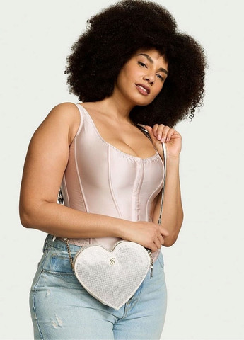 Жіноча сумочка Victoria´s Secret. Ця гламурна сумочка у формі серця мерехтить при кожному вашому русі. Верх виконаний із текстилю, повністю покритого стразами. Застібається на блискавку з двома бігунками. Усередині одне відділення на підкладці. Спереду металевий логотип бренду. Довгий регульований ремінець зі вставками у вигляді ланцюжка. Вміщує телефон, гаманець, ключі та інші предмети першої необхідності. Відмінна якість. Розмір: 21 * 18,5 * 5 см.