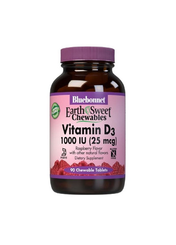 Властивості продукту: Допомагає підтримувати щільність кісток Підтримує нормальний кров'яний тиск Підтримує нормальний рівень цукру в крові Підтримує комфортний стан м'язів Сприяє зміцненню серцево-судинної системи Допомагає нормальній роботі нирок Підтримує нормальну роботу щитовидної залози Підтримує здоров'я шкіри Підтримує імунну систему Сприяє зняттю напруги в області голови Показання до застосування Приймати 1 жувальну таблетку на день або за рекомендацією фахівця. Що це? Вітамін D - жиророзчинний вітамін, необхідний практично всім системам життєдіяльності людини. Його також називають сонячним вітаміном, оскільки наш організм здатний накопичувати його в процесі прийому сонячних ванн. Earth Sweet Chewables від Bluebonnet забезпечує натуральний вітамін D3 (холекальциферол) з ланоліну з природним ароматом малини. Продукт підсолоджений повністю натуральною сумішшю концентратів соків і кристалами очерету. Як це працює? Головне завдання вітаміну D - забезпечити правильний ріст і розвиток кісткової тканини шляхом регуляції рівня кальцію в організмі. Крім цього він відновлює м'язи, підвищує імунітет, підтримує рівень фосфору в крові, бере участь в регуляції артеріального тиску, а значить, і в роботі серця. Також вітамін D необхідний для правильного функціонування нирок і щитовидної залози. Природний джерело вітаміну D - сонце, тому в першу чергу цей компонент засвоюється шкірою, надаючи на неї позитивний вплив. Брак цього вітаміну в організмі може викликати м'язові болі та мігрені, сприяти розвитку і загостренню екземи, псоріазу, діабету, гіпертонії та інших хвороб серця, викликати рахіт, аутизм, розсіяний склероз, рак і багато інших хвороб. Елемент Вага Одиниця Процент Порція 1 таблетка Порцій в упаковці 90 Калорії 2 Всього вуглеводів < 0,4 г < 1 Цукор < 0,4 г Вітамін D3 (у вигляді холекальциферолу з ланоліну) 50 (2000) мкг (МО) 250 Добова норма за умови споживання 2000 калорій в день.
