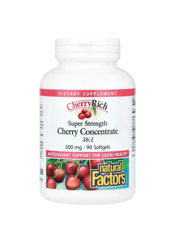 Вишневий концентрат 500 мг Cherry Concentrate Natural Factors, 90 гелевих капсул Cherry Concentrate від Natural Factors — це харчова (дієтична) добавка у формі м’яких гелевих капсул (софтгелів), створена для зручного доповнення щоденного раціону дорослих. Формула містить концентрат вишні CherryRich® 36:1 та додатково вітамін C. Продукт не є лікарським засобом. Основні особливості CherryRich® 36:1: концентрат із свіжих плодів вишні (Prunus avium) у заявленій кількості на порцію. Додатково вітамін C: у формі кальцію аскорбату — згідно з етикеткою виробника. Зручний формат: 1 софтгель — це одна порція; 90 порцій у контейнері. Прозора інформація: усі кількості наведено за Supplement Facts на упаковці. Кому може підійти Дорослим, які дотримуються збалансованого харчування та хочуть урізноманітнити раціон вишневим концентратом у зручній капсульній формі з додаванням вітаміну C. Продукт не призначений для діагностики, лікування чи профілактики захворювань. Склад і харчова інформація (на порцію) Розмір порції: 1 софтгель | Порцій у контейнері: 90 Компонент Кількість на порцію % від добової норми* Калорії 10 — Жири всього 1 г 1% Вітамін C (кальцію аскорбат) 100 мг 111% Вишневий концентрат CherryRich® 36:1 (зі свіжих плодів вишні, Prunus avium) 500 мг — * %DV для деяких інгредієнтів може бути не встановлена (—). Інші інгредієнти Органічна оливкова олія Extra Virgin; оболонка софтгелю (желатин, гліцерин, очищена вода); органічна олія насіння льону; лецитин соняшниковий (non-GMO); жовтий бджолиний віск. Спосіб застосування Дорослим: по 1 софтгелю на день. Орієнтуйтеся на рекомендації виробника на етикетці щодо часу та тривалості вживання. Вживати під час або після їжі, запиваючи водою. Не перевищувати рекомендовану кількість. Застереження Харчова добавка, не є лікарським засобом і не призначена для діагностики, лікування чи профілактики захворювань. Перед використанням уважно прочитайте інформацію на етикетці виробника. Можлива індивідуальна чутливість до компонентів. При необхідності проконсультуйтесь зі спеціалістом. Зберігати щільно закритим у сухому, прохолодному місці, поза доступом дітей. CherryRich® — зареєстрована торгова марка InovoBiologic Inc.