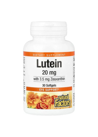 Лютеїн Lutein Natural Factors 20 мг 30 капсул — це натуральний каротиноїдний комплекс з лютеїном і зеаксантином, розроблений для підтримки зору, особливо в разі високого зорового навантаження, роботи за екраном, керування автомобілем і вікових змін. Формула підходить дорослим будь-якого віку, але особливо актуальна для тих, хто багато часу проводить за комп'ютером, скаржиться на сухість очей, зниження чіткості зображення або втому після читання і роботи з текстами. Лютеїн і зеаксантин — пігменти, які у великій кількості накопичуються в сітківці ока, насамперед у її центральній зоні — макулі. Ця область відповідає за гостроту зору, сприйняття деталей і кольорів. Лютеїн і зеаксантин виконують функцію світлового фільтра, захищаючи чутливі структури ока від впливу синього світла й ультрафіолету. Особливо важливо це під час постійної роботи за монітором, смартфоном, в умовах штучного освітлення і під час водіння в темний час доби. При регулярному прийомі лютеїн допомагає: знизити стомлюваність очей у разі тривалого зорового навантаження, поліпшити чіткість і контрастність зору, захистити очі від фотостаріння й окисного стресу, уповільнити вікові зміни в сітківці, включно зі зниженням щільності макулярного пігменту, зменшити дискомфорт у разі сухості очей, особливо в приміщеннях із кондиціонерами. Зеаксантин працює в парі з лютеїном, посилюючи його антиоксидантну дію і підтримуючи структуру макули. Разом вони допомагають зберегти зір у разі вікових змін, особливо у людей старше 40 років, а також за генетичної схильності до дегенерації жовтої плями. Лютеїн Lutein Natural Factors 20 мг 30 капсул — це точкова підтримка очей при цифровому навантаженні, в період зниження зорової функції або як частина регулярного догляду за зором у будь-якому віці. Особливо корисний тим, хто помічає зниження чіткості, частіше мружиться, відчуває втому очей або хоче зберегти зір під час роботи в напруженому ритмі. Рекомендації із застосування Приймати 1 капсулу на день під час їди або за рекомендацією лікаря. Состав Розмір порції: 1 капсула Порцій в упаковці: 30 Кількість в 1 порції % від добової норми Лютеїн LuteinRich™ (Tagetes erecta) (екстракт квіток чорнобривців) 20 мг ** Зеаксантин (Tagetes erecta) (екстракт квіток чорнобривців) 3,5 мг ** ** Добову норму не визначено. Додаткові інгредієнти: капсула (желатин, гліцерин, очищена вода, аннато, діоксид титану), сафлорова олія, органічна лляна олія, жовтий бджолиний віск, лецитин соняшника (без ГМО). Не містить: штучних консервантів, підсолоджувачів, молочних продуктів, крохмалю, цукру, пшениці, глютену, дріжджів, сої, яєць, риби, молюсків, солі, деревних горіхів, ГМО. Виготовлено компанією Natural Factors із гарантією безпеки й ефективності відповідно до стандартів належної виробничої практики (GMP), розроблених Управлінням із контролю якості харчових продуктів і лікарських засобів США й Міністерством охорони здоров’я Канади. Попередження Перед використанням слід проконсультуватися з лікарем, особливо під час вагітності, грудного вигодовування, за наявності будь-яких захворювань або під час прийому препаратів. Зберігати в недоступному для дітей місці. Продукт герметично упаковано з метою безпеки. Не використовуйте цей продукт, якщо захисна плівка пошкоджена. Зберігати в сухому та прохолодному місці для збереження свіжості.