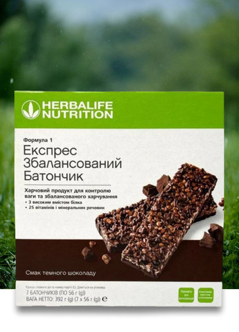 Експрес батончик Формула 1 "Темний шоколад" - це смачний спосіб насолодитися збалансованим і поживним прийомом їжі в будь-який час і в будь-якому місці, розроблений для підтримки енергії та насичення протягом дня. Батончик містить високоякісний білок, який сприяє підтримці м'язової маси та загального тонусу організму. Вітаміни і мінерали забезпечують необхідну підтримку обмінних процесів та зміцнення імунітету. Харчові волокна покращують травлення та сприяють тривалому відчуттю ситості. Експрес батончик може використовуватись як повноцінна заміна прийому їжі або як зручний варіант швидкого харчування. СМАК: Темний шоколад ПЕРЕВАГИ: Збалансований склад, що включає якісний білок, вітаміни, мінерали та харчові волокна для повноцінного харчування. Приголомшливий смак, який забезпечує приємне смакове задоволення. Енергетична підтримка, що допомагає зберегти відчуття ситості та бадьорості на тривалий час. Підходить для контролю ваги завдяки оптимальному поєднанню поживних речовин. Містить 13 г білка, 8,1 г харчових волокон, 207 калорій в одному батончику Вегетаріанський продукт, що не містить інгредієнтів тваринного походження. Зручна упаковка - завжди під рукою. В упаковці знаходиться 7 батончиків по 56 грамів кожен, що забезпечує зручність зберігання і використання протягом кількох днів. СКЛАД: Cоєві чипси (24,2 %) (ізолят соєвого білка, крохмаль тапіоки, сіль), глюкозний сироп, шоколадна глазур (12,5 %, сухі какао мінімум 56 %) (цукор, какао терте, какао-масло, емульгатор (лецитини (соя)), розчинна кукурудзяна клітковина, соєві гранули (10,4 %), фруктоза, суміш мінеральних речовин (карбонат кальцію, калієві солі ортофосфорної кислоти, хлорид калію, оксид магнію, пірофосфат заліза, оксид цинку, селеніт натрію, сульфат марганцю, глюконат міді, йодид калію), зволожувач (гліцерин), мальтодекстрин, какао терте, рисові чипси (2,1 %) (рисове борошно, порошок рисового сиропу), шоколадні пелюстки (1,8 %, сухі какао мінімум 48 %) (цукор, какао терте, какао-масло, емульгатор (лецитини (соя)), ароматизатор), какао-порошок зі зниженим вмістом жиру (какао-масло: мінімум 10 %), рослинні олії (повністю очищена, соняшникова та/або соєва), ароматизатори, хлорид натрію, суміш вітамінів (Вітамін С (-аскорбінова кислота), Вітамін Е (DL-альфа токоферилацетат), ніацин (нікотинамід), Вітамін А (ретинілацетат), пантотенова кислота (D-пантотенат кальцію). біотин (D-біотин), Вітамін B12 (ціанокобаламін), Вітамін D3 (холекальциферол), Вітамін В6 (піридоксин), Вітамін В1 (тіамін мононітрат), Вітамін К (філохінон), грибофлавін, фолієва кислота (птероїлмоноглутамінова кислота)), натуральний ароматизатор, регулятор кислотності (лимонна кислота). СПОСІБ ВЖИВАННЯ: Використовуйте батончик як заміну одного прийому їжі у разі необхідності швидкого і збалансованого харчування. Підходить для вживання як перекусу між основними прийомами їжі для підтримання енергії та концентрації. Можна вживати у поєднанні з іншими продуктами при низькокалорійній дієті. Не забудьте випити з батончиком склянку води, оскільки він є джерелом клітковини!