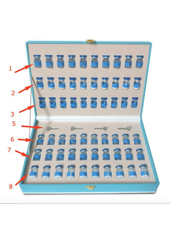 Набір препаратів для косметологічних комбайнів та багатофункціональних косметологічних апаратів. "Міні - набір" - це 1\10 частина великого професійного набору сироваток. В міні набір входить 6 пляшок по 5 мл. Для різних процедур і 1 багаторазова піпетка. Міні - набір розрахований на 1 процедуру. Безпосередньо від виробника! Низька собівартість 1 косметологічної процедури! Мезококтейлі (сироватки) призначені для різних косметологічних процедур. Підійдуть для всіх косметологічних комбайнів і багатьох косметологічних апаратів для безін'єкційних методів мезотерапії. Протокол нанесення. 1. Змочуємо очищене обличчя водою. Наносимо на шкіру пом'якшує гидро- кисневу очищувальну есенцію (гель). Залишаємо на 15 хвилин. Потім масажуємо обличчя 3 хвилини. Після робимо процедуру водневого пілінгу або гідропилинга. (Якщо у вас немає даних апаратів, то ви можете провести ультразвукову чистку шкіри УЗ скрабером) 2. Змішати флакон з 2 ряду (кисневий порошок) з флаконом з 3 ряди (кисневої водної есенцією). Нанести до шкіру. Використовувати можна будь безін'єкціонний апарат для мезотерапії, наприклад ультразвук. Для косметологічних комбайнів рекомендується використовувати з апаратом кисневої мезотерапії (оксімезотерапии) 3. Гідрокси колагеновий шовк з пляшечки 4 ряди змішати з чистим гідро- кисневим розчином. Нанести на обличчя для процедури безін'єкційної мезотерапії. У косметологічних багатофункціональних комбайнах рекомендується використовувати мезоінжектор. При його відсутності можна проводити процедуру ультразвуком або іншими апаратами безін'єкційної мезотерапії. Процедура по тривалості не повинна перевищувати 20 хвилин. Якщо ви не можете використовувати з якихось причин косметологічний апарат (наприклад, протипоказання для клієнта), можна замінити апарат 15-ти хвилинним ручним масажем. 4. Препарат з 6 ряду потрібно нанести на обличчя і вводити будь косметологічним апаратом безін'єкційної мезотерапії, в тому числі ультразвуковим (крім апарату кисневої мезотерапії). Добре поєднується з апаратом світлотерапії (LED маскою). Результат буде видно після 1 процедури. Рекомендується для одного клієнта провести 3-5 процедур з інтервалом 6-7 днів. Після цього проводити підтримуючу процедуру 1 раз на 2-3 місяці. Має накопичувальний характер.