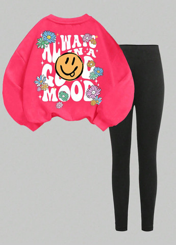Цей комплект із двох предметів призначений для дівчаток-підлітків. Худі оверсайз з капюшоном та принтом у вигляді букв. У комплект входять вузькі чорні легінси. Тканина трохи тягнеться для комфорту. Також є кишеня в худі.