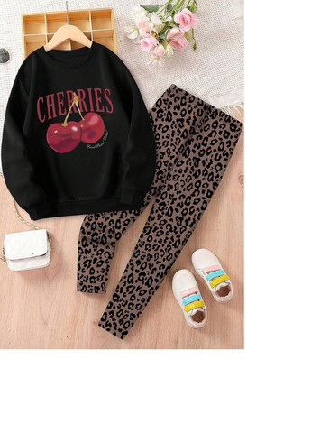 Це вбрання для дівчаток складається зі світшота з принтом вишні та легогенсів з леопардовим принтом. Світшот має вільний крій та рукави з приспущеним плечем. Легінси також мають вільний крій. Тканина трішки тягнеться. Вбрання на підкладці для додаткового тепла. Включає виріз круглий.