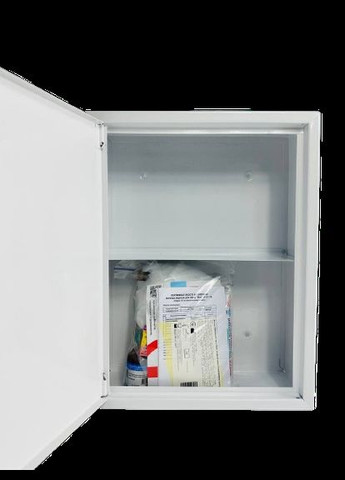 Аптечка медична "Для офісу Maxi" згідно ТУ. Перелік вкладень: Бинт стерильний (5 м х 10 см) 1шт Бинт нестерильний (7 м х 14 см) 1шт Джгут тканинний з маячком 1шт Вата нестерильна (25 г) 1шт Лейкопластир бактерицидний (7,2 х 1,9 см) 4шт Лейкопластир котушковий (1 см х 5 м) 1шт Амміаку розчин (10%фл. 40 мл) 1шт Серветка для обробки ран стерильна 2шт в компл.(10 х 10 см) 3 компл. Булавка англійська 2шт Рукавички п/е 2 пари Корвалол краплі (25 мл) 1шт Активоване вугілля табл.№10 1шт Пристрій для штучного дихання 1шт Ацетилсаліцилова к-та табл.(0.5 №10) 1шт Довідник надання першої допомоги 1шт Сертифікат 1шт Серветка медична з хлоргексидином (6 х 10 см) 2шт Ящик для медикаментів Аптечка з однією поличкою(300*390*120) Серветка медична антимікробна з фурагіном (10 х 13 см) 2шт