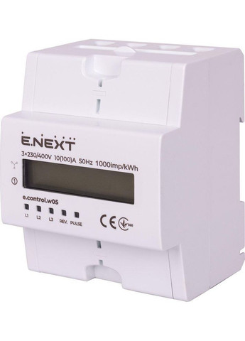 E.Next — європейський бренд сучасного електротехнічного обладнання E.Next — міжнародна компанія зі штаб-квартирою в Європі, що спеціалізується на розробці та постачанні комплексних рішень у сфері електротехніки, автоматизації та енергозабезпечення. Продукція бренду орієнтована на потреби сучасної промисловості, будівництва, енергетики, а також житлового та комерційного секторів. Компанія активно розвиває власні виробничі майданчики та інжинірингові центри у різних країнах Європи та Азії, що дозволяє контролювати якість на всіх етапах — від проєктування до кінцевого виробу. Бренд вирізняється відмінним співвідношенням ціни та якості, сучасним дизайном, а також адаптацією рішень до умов експлуатації в країнах Східної Європи. У портфелі E.Next сьогодні присутні: автоматичні вимикачі та захисні пристрої, електрощитове обладнання, пускорегулювальна апаратура, модульні системи автоматизації, промислові роз'єми, кабельно-провідникова продукція та освітлення Лічильник електроенергії 3-фазний e.control.w05 10(100)А E.Next i0310032 e.control.w05 — це трифазний електронний лічильник активної енергії змінного струму, призначений для внутрішнього (некомерційного) обліку електроенергії для монтажу на дін-рейку. Завдяки компактній конструкції (ширина лише 70 мм, що відповідає 4 модулям), він ідеально підходить для встановлення в обмежених умовах. Монтаж виконується на стандартну DIN-рейку в пластиковий або металевий корпус. Застосовується в офісах, комерційних приміщеннях, квартирах, виробничих ділянках тощо. Технічні характеристики Параметр Значення Артикул i0310032 Кількість фаз 3 Тип енергії Активна Тип струму AC Номінальна напруга Ue 3×230/400 В Номінальний струм (In) 10 А Максимальний струм 100 А Номінальна частота 50/60 Гц Діапазон робочих температур -25…+55 °С Монтаж На DIN-рейку Розміри (Д×В×Ш) 65 × 93 × 76 мм Ширина у модулях 4 Макс. переріз провідників до 25 мм² Контактне зусилля 0,5 Н·м Ступінь захисту корпусу IP20 Клас забруднення середовища 3 Стандарти відповідності ДСТУ EN 60730-1, EN 61010-1 Утилізація Передача спецпідприємству Особливості Призначений для некомерційного внутрішнього обліку енергії. Простий у встановленні завдяки DIN-кріпленню. Надійна конструкція для щитів обліку в багатоквартирних будинках, офісах, складських приміщеннях тощо. Високий робочий струм — до 100 А.