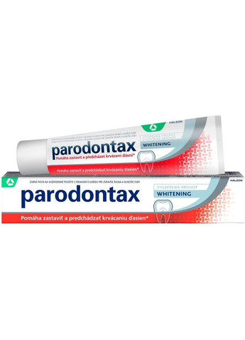 Зубна паста Parodontax (Пародонтакс) Відбілювання - це лікувально-профілактичний засіб особистої гігієни позбавляє ясна від болісних відчуттів та кровоточивості, а зубам забезпечує природний відтінок, ефективно відбілюючи їх. Паста відрізняється складом, збагаченим рослинними екстрактами та мінеральними солями. Основні переваги: одним з основних активних компонентів є фторид натрію, який дозволяє насичувати необхідними мінералами зубну емаль, тим самим роблячи її міцнішою та щільнішою за відбілюючий та антисептичний ефекти відповідальний бікарбонат натрію, який здатний боротися з неприємним запахом для забезпечення антибактеріальних та протизапальних властивостей формулу збагатили екстрактом ехінацеї екстракт мирри наділяє засіб захисною здатністю, щоб він міг зміцнювати ясна і усувати кровоточивість до складу додана шавлія, відома своїми зміцнюючими та очищаючими властивостями, а також ратаннія, що створює тонізуючий та в'яжучий ефекти, що додає яснам еластичності та пружності, а також ромашка, яка славиться тонізуючими, протизапальними та заспокійливими властивостями Спосіб застосування: невелику кількість зубної пасти нанести на зубну щітку чистити зуби круговими рухами, одночасно акуратно масажуючи ясна порожнину рота обполоснути невеликою кількістю води, затримуючи її на 20-30 секунд Характеристики Об'єм: 75 мл Виробник: Parodontax, Словаччина.